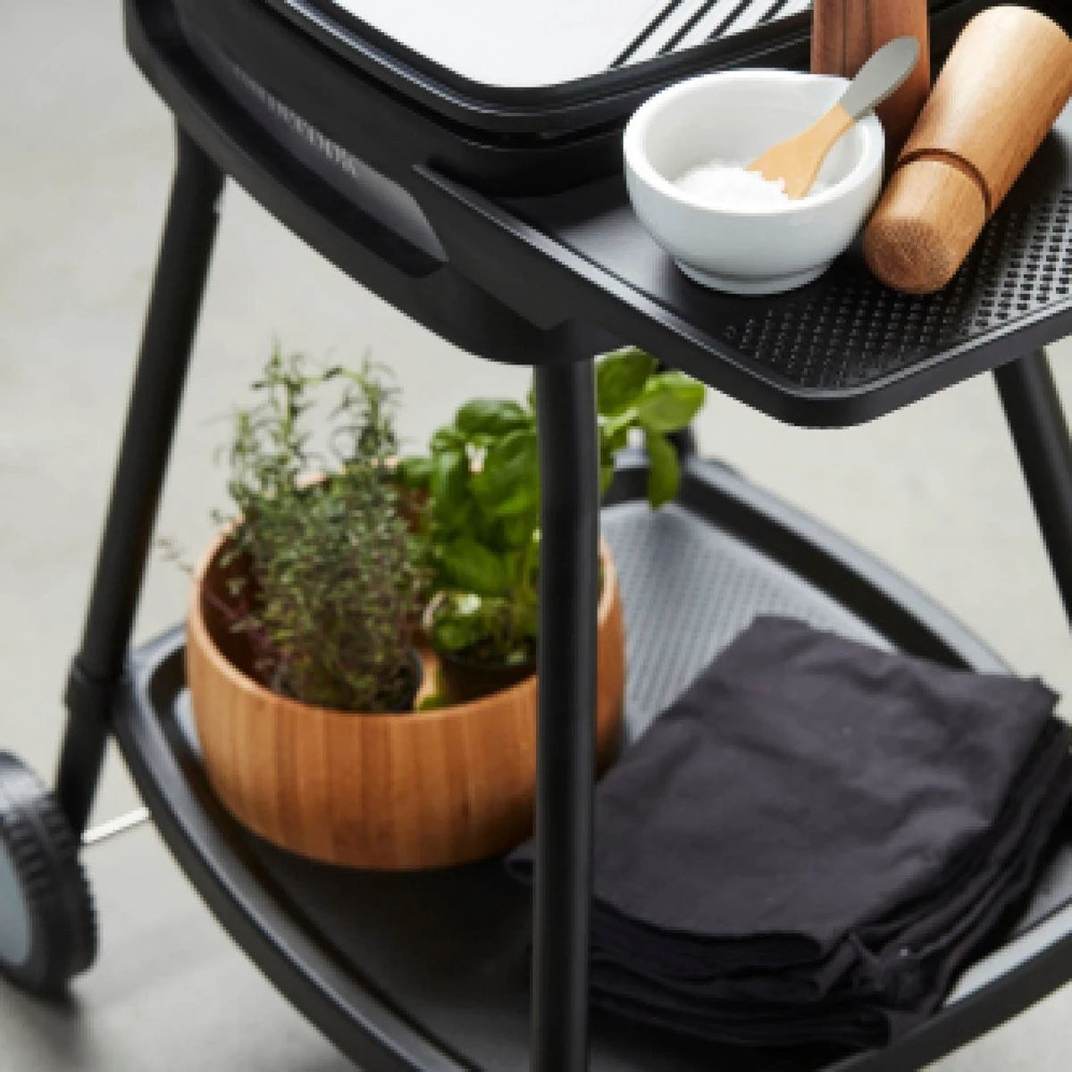 ▶ Zijtafel met accessoirehaken en grote wielen.