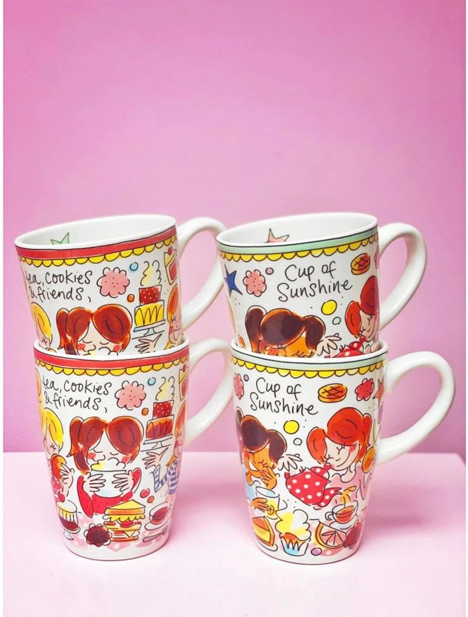 Deze grote Blond Amsterdam XL beker is onderdeel van de welbekende Even Bijkletsen serie en heeft een inhoud van 500 ml. De rand van de beker heeft een rode kleur, wat onderdeel is van deze vernieuwde lijn. De mok staat vol met herkenbare en vrolijke illustraties en aan de binnenkant staat een mintkleurige ster. De aardewerk beker is perfect voor groot glas thee of warme chocolademelk met slagroom. Ontdek de rest van het vrolijke Blond Amsterdam servies en alle andere koppen en mokken in onze webshop.
