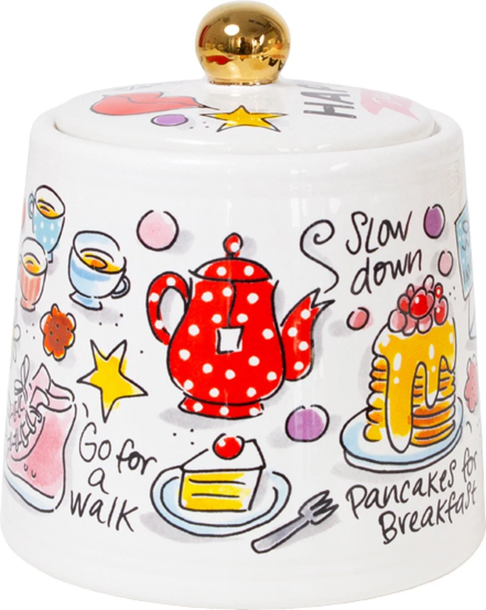 This make me happy! Deze vrolijke suikerpot, maakt jouw tafel nog gezelliger! De opvallende en kleurrijke illustraties zijn in het thema Happy ontworpen. Dit suikerpotje heeft allemaal happy illustraties en teksten en is afgemaakt met een gouden dop. De suikerpot is leuk te combineren met de andere nieuwe Happy items.