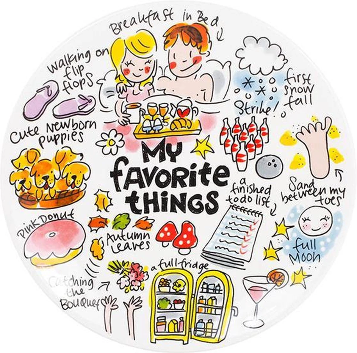 Lekkere Belgische chocolaatjes, een bos verse bloemen of lekker met een nieuw boek op de bank. Al onze favoriete dingen zijn afgebeeld op dit vrolijke Blond Amsterdam servies.