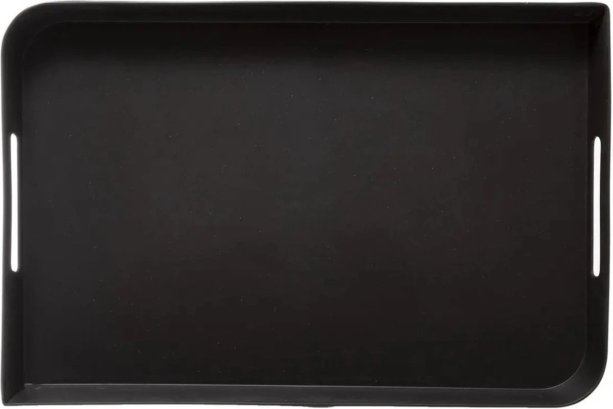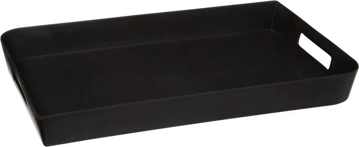 Dienblad/serveerblad rechthoekig zwart. Dit serveerblad beschikt over handige handvaten en heeft een moderne uitstraling omdat het zowel ronde als puntige hoeken heeft. Makkelijk schoon te maken met een vochtige doek. Afmeting: 45 x 30 x 5 cm. Materiaal: kunststof.