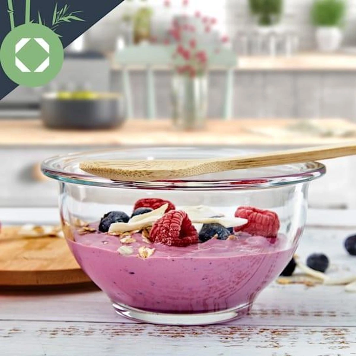 - Allrounder: veelzijdige glazen schaal met bamboe deksel