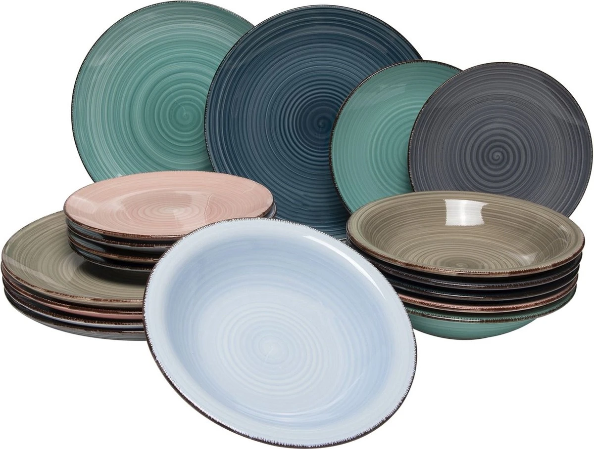 Kleurrijk maar toch rustig servies? Dan is deze serviesset van Studio Tavola perfect voor jou! Dit servies heeft 6 verschillende pastel kleuren. Kleurrijk, maar alsnog straalt het rust uit. Let wel op: deze borden worden gemixt geleverd, er kan dus geen kleur gekozen worden. Combineer de serviesset met de kommen uit de collectie, of combineer het juist met de andere kleuren van het Studio Tavola Servies. Na gebruik mag het servies in de vaatwasser, maar handwas wordt aangeraden. Zo blijft je servies lang mooi. De set bestaat uit: 6 x Studio Tavola Ontbijtborden Barbados Ø 22 cm 6 x Studio Tavola Diepe borden Barbados Ø 21 cm 6 x Studio Tavola Dinerborden Barbados Ø 27 cm